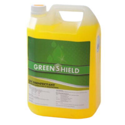 Greenshield QAC Disinfectant (Bathroom) in a 5L container is a medium-strength surface disinfectant formulated for everyday use. The active ingredient is Quaternary Ammonium Compound (QAC), which is known for its disinfecting properties. This disinfectant is designed to provide protection against viruses, bacteria, fungi, and spores on various surfaces, including kitchen and bathroom surfaces, floors, countertops, and more. It offers a convenient and effective solution for maintaining a hygienic and sanitized environment in your home or commercial space.