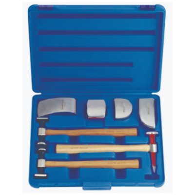 Perfect for both professionals and DIY enthusiasts, this set provides everything needed for effective auto body repair. - Content: – Standard bumping hammer (9CF110) – Light shrinking hammer (9CF120) – Straight pein & finishing hammer (9CF132) – Utility dolly (9CF210) – Curved dolly (9CF220) – Heel dolly (9CF230) – Thin toe dolly (9CF241)