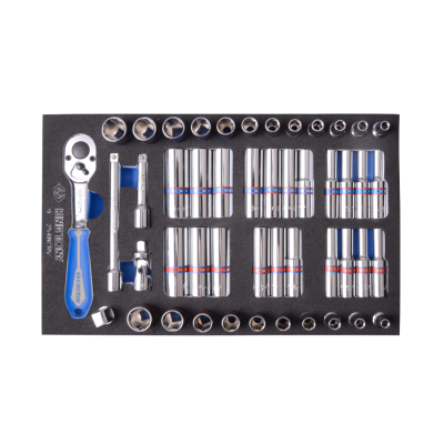 - 48 PC. 1/4" Drive 6-Point Socket Set for Tool Chest (EVA Foam) - Socket Type: 6-point hexagon sockets designed for maximum grip and durability. - Tray Size: Organized in Tray Category #2 (163 x 263mm) for efficient storage. - Drawer Compatibility: Fits perfectly in Drawer B1 (172 x 275mm) of tool chests. - Material: Includes EVA foam insert for secure and easy tool access. - Set Content: Comprehensive 48-piece set to meet various mechanical needs.