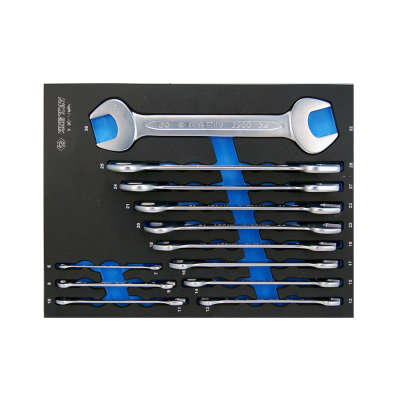 - 12-Piece Open End Wrench Set for Tool Trolley with EVA Foam - Application: Specialized for automotive use, compatible with Volkswagen Group, Mercedes-Benz, Opel, BMW, and Japanese passenger cars - Tray Size: Category #9 (280 x 375 mm) - Drawer Compatibility: Fits Drawer B3 (579 x 380 mm) - Features: Comes in EVA foam for secure storage and organization