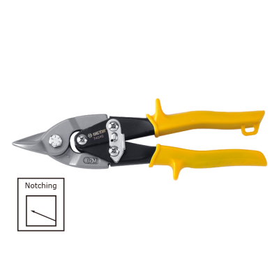 - Type: Compound-action snips designed for notch cuts - Material: Crafted from drop forged chrome molybdenum alloy steel for durability - Blade Features: Serrated edges for efficient cutting - Cutting Capacity: Capable of cutting up to 1.2mm rolled steel or 0.7mm stainless steel - Hardened Edges: Induction hardened cutting edges with a hardness of 59-62 HRC for longevity - Design: Special labor-saving design for ease of use - Strength: High tensile strength and high torsional strength spring for optimal cutting performance - Handle: Solid and comfortable handle with non-slip design for enhanced grip - Storage: Hang-up hole provided for convenient storage - Safety Feature: Equipped with a safety auto latch (D.PAT.) for added security