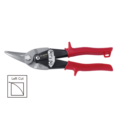 - Type: Compound-action snips designed for left cuts - Material: Crafted from drop forged chrome molybdenum alloy steel for durability - Blade Features: Serrated edges for efficient cutting - Cutting Capacity: Capable of cutting up to 1.2mm rolled steel or 0.7mm stainless steel - Hardened Edges: Induction hardened cutting edges with a hardness of 59-62 HRC for longevity - Design: Special labor-saving design with high tensile and torsional strength spring for ease of use - Handle: Solid and comfortable handle with non-slip design for enhanced grip - Storage: Hang-up hole provided for convenient storage - Safety Feature: Equipped with a safety auto latch (D.PAT.) for added security