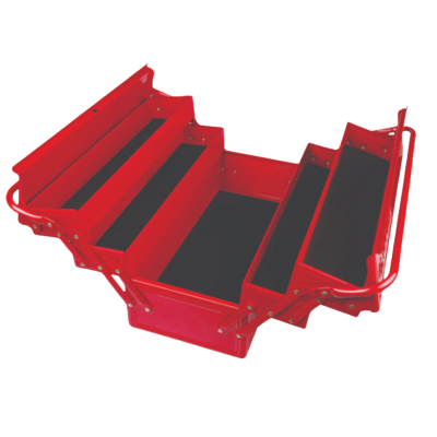 Toolbox Cantilever 5 Tier Red 3-section fold-up type portable tool box Pull-down handle for easy carrying Reinforced and punched side panels for durability Features 5 compartments on 3 levels Compartments are protected by a thin foam layer Includes a top hole for locking Overall Size (mm): (L)470 x (D)220 x (H)260 Hold Size (mm): (L)468 x (D)218 x (H)120 Compartment Size (mm): (L)468 x (D)107 x (H)53 (4) Weight (Kg): 5.60