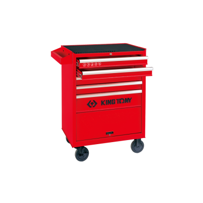 5-Drawer Ball Bearing Type Tool Trolley Cart Features 5 drawers with ball bearing slides for smooth operation Includes a 26-inch roll-wagon with bulk storage compartment Frame constructed from one-piece steel sheet for integral strength Equipped with a useful tool tray and special side handle for easy mobility Grooved full-width drawer pulls add strength and allow for easy content listing Central locking system ensures security Includes a 10mm top mat for added protection Powder coating finish for durability Overall Size (mm): 670 (W) x 460 (D) x 812 (H)