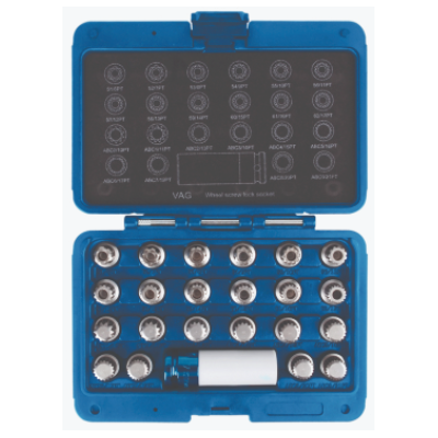 - Wheel Lock Screw Socket Set (VW) – 23pcs - Versatile Functionality: Essential for servicing VW vehicles, even if the key is lost. - Wide Compatibility: Ideal for installing and removing locks on most VW models. - High-Quality Construction: Made from chrome molybdenum alloy steel and chrome plated for maximum durability and corrosion resistance. - Comprehensive Set: Includes a range of socket sizes: #51/6PT, #52/7PT, #53/8PT, #54/9PT, #55/10PT, #56/11PT, #57/18PT, #58/13PT, #59/14PT, #60/15PT, #61/16P, #62/17PTT, #ABC0/10PT, ABC1/11PT, ABC2/13PT, ABC3/14PT, ABC4/15PT, ABC5/16PT, #ABC6/17PT, ABC7/19PT, ABC8/20PT, ABC9/21PT, and #494517M (1/2?DR. x 17mm).