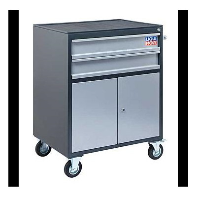 Workshop trolley made of powder-coated sheet steel. • 2 lockable drawers • 1 lockable double door • 4 transport castors • handle • dimensions: 1,000 x 830 x 550 mm (H x W x D) • weight: 50 kg • two-tone made of robust sheet metal (color: body RAL 7016, doors and drawers 9006)