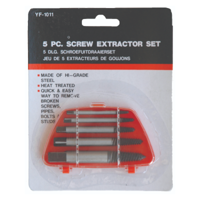 Sizes Included: Imperial: No. 1: 1/8” – 1/4” No. 2: 1/4” – 5/16” No. 3: 5/16” – 7/16” No. 4: 7/16” – 9/16” No. 5: 9/16” – 3/4” Metric: No. 1: 3 – 6 mm No. 2: 6 – 8 mm No. 3: 8 – 11 mm No. 4: 11 – 14 mm No. 5: 14 – 18 mm Material: Made of high-grade steel for durability Heat Treated: Ensures enhanced strength and longevity Functionality: Quick and easy way to remove broken screws, pipes, bolts, and studs The 5-Piece Screw Extractor Set is your essential toolkit for efficiently removing broken fasteners. This versatile set includes both imperial and metric sizes, providing options for a wide range of applications.