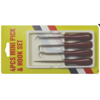 4-Piece Precision Tool Set: Includes essential picks and hooks for detailed work and precision tasks. Tools Included: Goose-Neck Pick – Ideal for delicate maneuvering in tight spaces. 90º Pick – Perfect for reaching difficult angles. Rounded 90º Hook – Great for pulling, hooking, and aligning components. Straight Pick – Provides precise control for intricate jobs. Versatile Applications: Perfect for automotive repairs, electronics, and intricate assembly tasks. Durable Build: Made with high-quality materials to withstand frequent use.