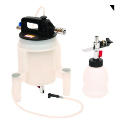 Vacuum-operated system powered by compressed air for effortless brake fluid extraction and re-filling. Automatic re-filling design ensures seamless fluid replenishment during brake maintenance. Built-in safety mechanism: the air inlet is automatically shut off when the fluid reaches its maximum level, preventing overflows. One-person operation for fast, clean, and simple brake fluid management. Max air consumption: 5.0 CFM for efficient operation. Specifications: