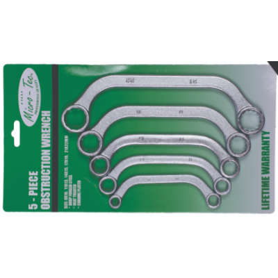 Material: Heavy-duty chrome vanadium steel Designed for Access: Perfect for working around obstructions Manufacturing: Cold stamped for enhanced durability Packaging: Blister carded for easy storage and display Sizes Included: 10x11 mm, 12x13 mm, 14x15 mm, 17x19 mm, 21x22 mm Upgrade your toolkit with the 5-Piece Obstruction Wrench Set, specifically designed to provide easy access in tight spaces and around obstructions. Constructed from heavy-duty chrome vanadium steel, these wrenches are built to withstand rigorous use.