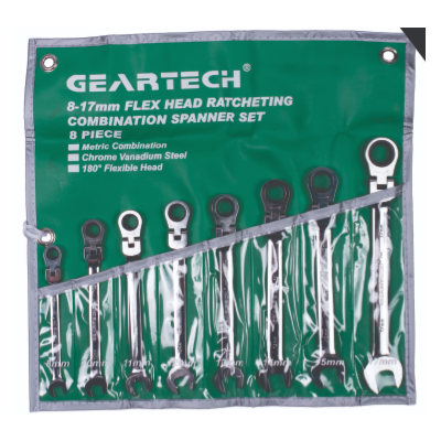 Keep your toolbox organized with our 8-piece combination flexible RATCHET ring flat wrench set, conveniently packaged in a durable canvas pouch. This set includes sizes: 8, 10, 11, 12, 13, 14, 15, and 17 mm.