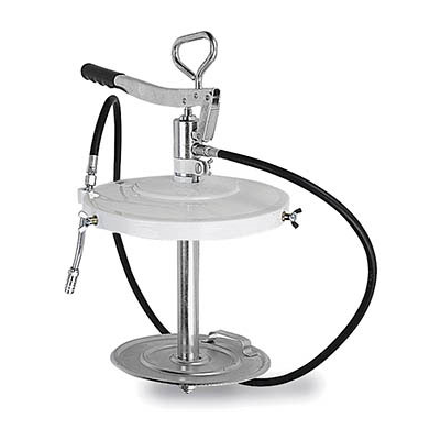 High pressure steel pumps to be mounted directly onto original grease kegs, 12.5 to 18 kg. Includes a 310 mm drum cover. Pump equipped with carrying handle, cover with pump adaptor, follower disc and 1,5 m high pressure hose with rigid stem and fourjaw hydraulic connector. Delivery per stroke 2 cc. Maximum pressure: 350 bar (5,000 psi).