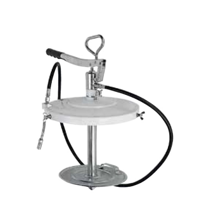 High pressure steel pumps to be mounted directly onto original grease kegs, 20 kg. Includes a 330 mm drum cover. Pump equipped with carrying handle, cover with pump adaptor, follower disc and 1,5 m high pressure hose with rigid stem and fourjaw hydraulic connector. Delivery per stroke 2 cc. Maximum pressure: 350 bar (5,000 psi).