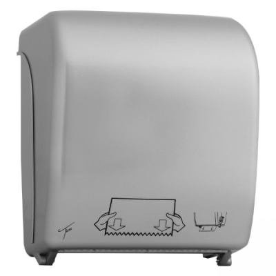 Hands free. No batteries (reflex + lever). Dimensions: 18x29x36 cm. Dispenses most non perforated rolls up to 20,32 wide x 15,24 diameter(cm)