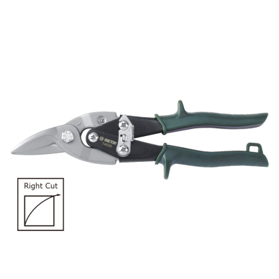 - Type: Compound-action snips designed for right cuts - Material: Constructed from drop forged chrome molybdenum alloy steel for durability - Blade Features: Serrated edges for effective cutting - Cutting Capacity: Capable of cutting up to 1.2mm rolled steel or 0.7mm stainless steel - Hardened Edges: Induction hardened cutting edges with a hardness of 59-62 HRC for durability - Design: Special labor-saving design for ease of use - Strength: High tensile and torsional strength spring for efficient cutting performance - Handle: Solid and comfortable handle with non-slip design for enhanced grip - Storage: Hang-up hole provided for convenient storage - Safety Feature: Equipped with a safety auto latch (D.PAT.) for added security